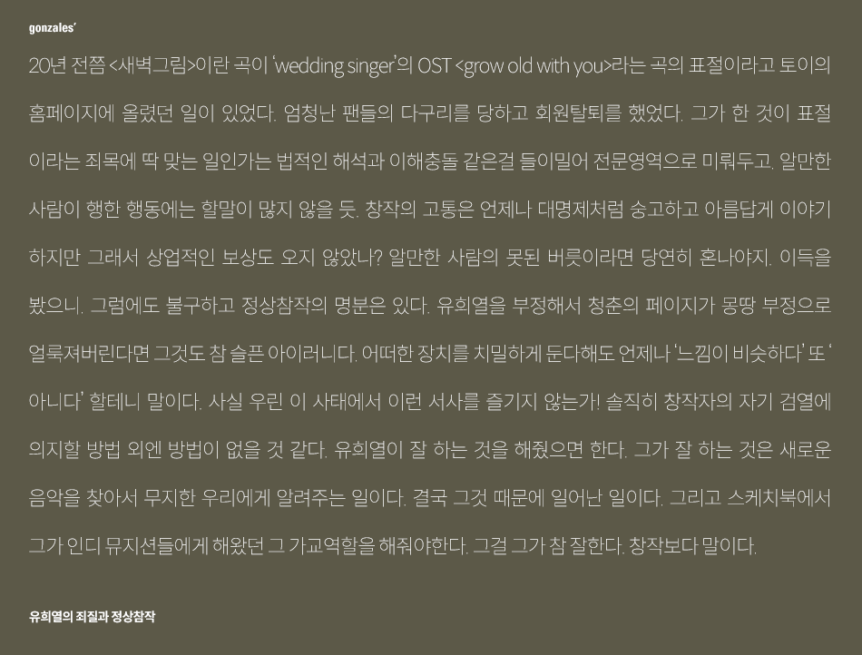 그럼에도 불구하고 정상참작의 명분은 있다. 유희열을 부정해서 청춘의 페이지가 몽땅 부정으로 얼룩져버린다면 그것도 참 슬픈 아이러니다.
