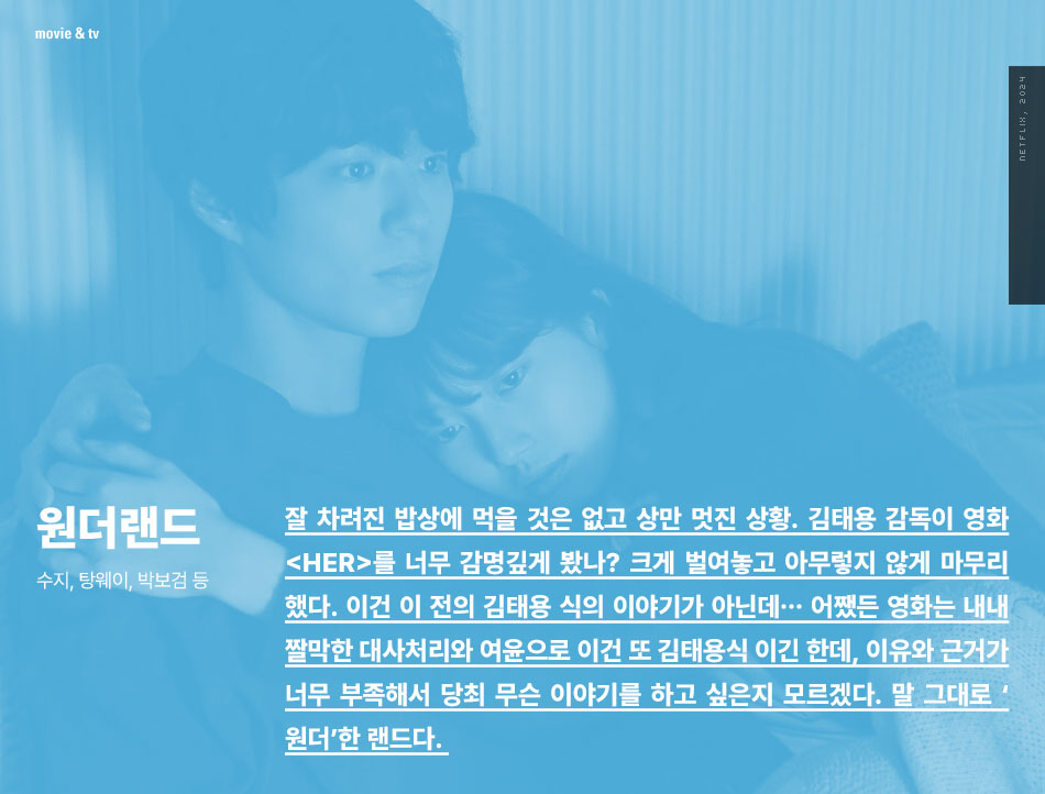 잘 차려진 밥상에 먹을 것은 없고 상만 멋진 상황. 김태용 감독이 영화 <her>를 너무 감명깊게 봤나? 크게 벌여놓고 아무렇지 않게 마무리 했다. 이건 이 전의 김태용 식의 이야기가 아닌데… 어쨌든 영화는 내내 짤막한 대사처리와 여운으로 이건 또 김태용식 이긴 한데, 이유와 근거가 너무 부족해서 당최 무슨 이야기를 하고 싶은지 모르겠다. 말 그대로 ‘원더’한 랜드다.