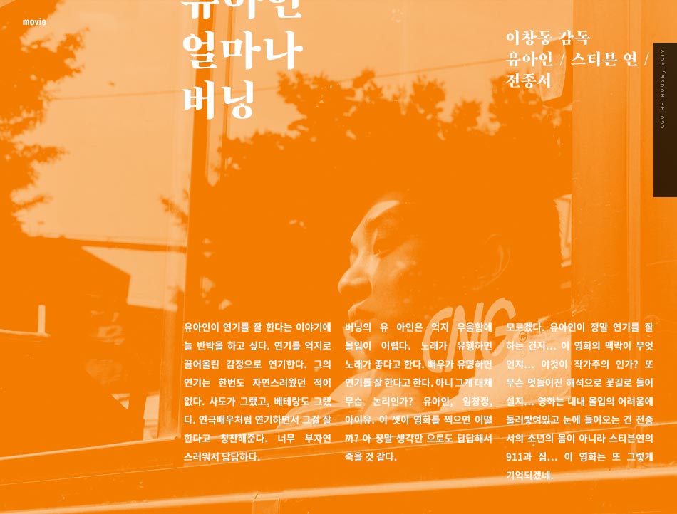 유아인이 연기를 잘 한다는 이야기에 늘 반박을 하고 싶다. 연기를 억지로 끌어올린 감정으로 연기한다. 그의 연기는 한번도 자연스러웠던 적이 없다. 사도가 그랬고, 베테랑도 그랬다. 연극배우처럼 연기하면서 그걸 잘 한다고 칭찬해준다. 너무 부자연스러워서 답답하다. 버닝의 유아인은 억지 우울함에 몰입이 어렵다. 노래가 유행하면 노래가 좋다고 한다. 배우가 유명하면 연기를 잘 한다고 한다. 아니 그게 대체 무슨 논리인가?
