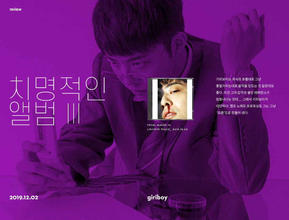 기리보이는 의식의 흐름대로 그냥 흥얼거리는대로 음악을 만드는 것 같은데도 좋다. 이건 그의 감각과 쌓인 레퍼런스가 엄청나다는 건데… 그래서 기리보이가 대단하다. 랩도 노래도 프로듀싱도 그는 그냥 ‘요즘’으로 만들어 낸다.