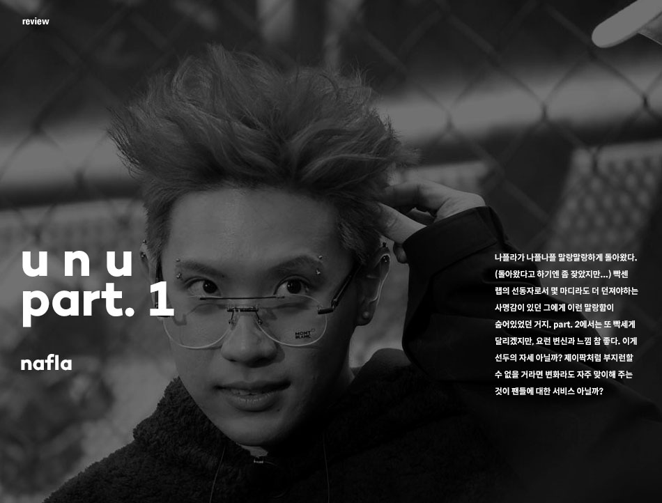 나플라가 나플나플 말랑말랑하게 돌아왔다. (돌아왔다고 하기엔 좀 잦았지만…) 빡센 랩의 선동자로서 몇 마디라도 더 던져야하는 사명감이 있던 그에게 이런 말랑함이 숨어있었던 거지. part. 2에서는 또 빡세게 달리겠지만, 요런 변신과 느낌 참 좋다. 이게 선두의 자세 아닐까? 제이팍처럼 부지런할 수 없을 거라면 변화라도 자주 맞이해 주는 것이 팬들에 대한 서비스 아닐까?