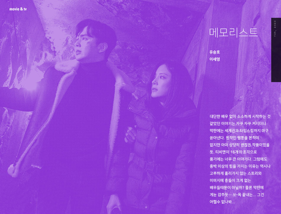 대단한 배우 없이 소소하게 시작하는 것 같았던 이야기는 자꾸 자꾸 커지더니 막판에는 세계관과 타임스립까지 마구 쏟아낸다. 원작인 웹툰을 본적이 없지만 아마 상당히 괜찮은 작품이었을 듯. 티비엔이 16개의 조각으로 품기에는 너무 큰 이야기다. 그럼에도 중박 이상의 힘을 가지는 이유는 역시나 고루하게 흘러가지 않는 스토리와 이미지에 충돌이 크게 없는 배우들때문이 아닐까? 물론 막판에 게눈 감추듯… 쏘-옥 끝내는… 그건 어쩔수 없나봐…