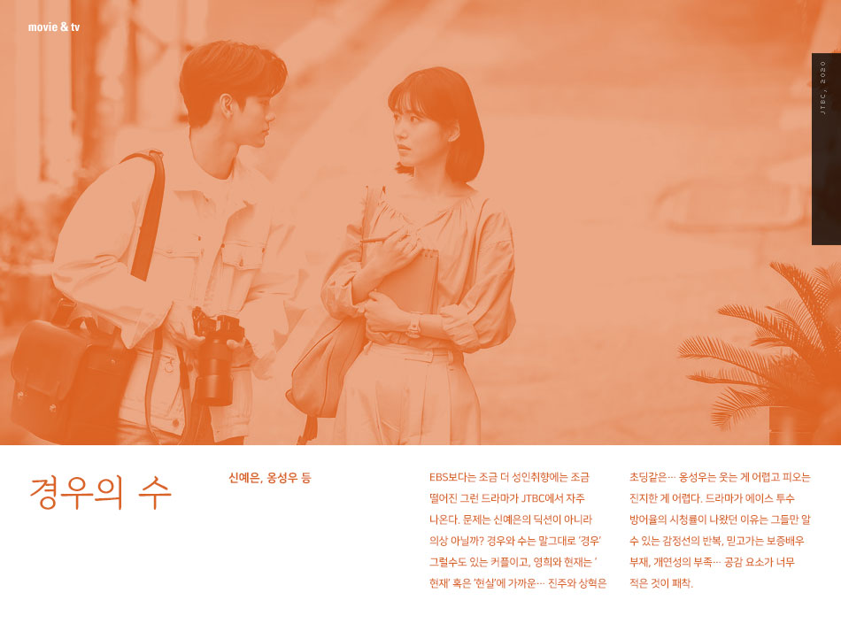 EBS보다는 조금 더 성인취향에는 조금 떨어진 그런 드라마가 JTBC에서 자주 나온다. 문제는 신예은의 딕션이 아니라 의상 아닐까? 경우와 수는 말그대로 ‘경우’ 그럴수도 있는 커플이고, 영희와 현재는 ‘현재’ 혹은 ‘현실’에 가까운… 진주와 상혁은 초딩같은… 옹성우는 웃는 게 어렵고 피오는 진지한 게 어렵다. 드라마가 에이스 투수 방어율의 시청률이 나왔던 이유는 그들만 알 수 있는 감정선의 반복, 믿고가는 보증배우 부재, 개연성의 부족… 공감 요소가 너무 적은 것이 패착.