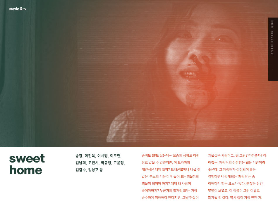 좀비도 SF도 싫은데… 요즘의 상황도 이런 장르 같을 수 있겠지만, 이 드라마의 개연성은 대체 뭘까? 드래곤볼에나 나올 것 같은 ‘분노의 기운’이 만들어내는 괴물? 왜 괴물이 되어야 하지? 대체 왜 사람이 죽어야하지? 누군가의 말처럼 SF는 가장 순수하게 이해해야 한다치면, 그냥 현실이 괴물같은 사람이고, 뭐 그런건가? 풍자? 아 어쨌든, 캐릭터의 신선함은 웹툰 기반이라 좋은데, 그 캐릭터가 성장되며 혹은 경험하면서 갖게되는 ‘캐릭터’는 좀 이해하기 힘든 요소가 많다. 괜찮은 신인 몇명이 보였고, 이 작품이 그런 이유로 회자될 것 같다. 역시 집이 가장 편한 거.