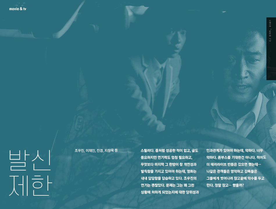 스릴러다. 좀처럼 성공한 적이 없고, 글도 중요하지만 연기력도 엄청 필요하고, 무엇보다 마지막 그 한방이 참 개연성과 발칙함을 가지고 있어야 하는데, 영화는 내내 답답함을 답습하고 있다. 조우진의 연기는 괜찮았다. 문제는 그는 왜 그런 상황에 처하게 되었는지에 대한 당위성과 인과관계가 있어야 하는데, 약하다. 너무 약하다. 폰부스를 기대한건 아니다. 적어도 더 테러라이브 반쯤은 갔으면 했는데… 나같은 관객들은 영악하고 감독들은 그들에게 벗어나려 장고끝에 악수를 두고 만다. 정말 장고… 했을까?