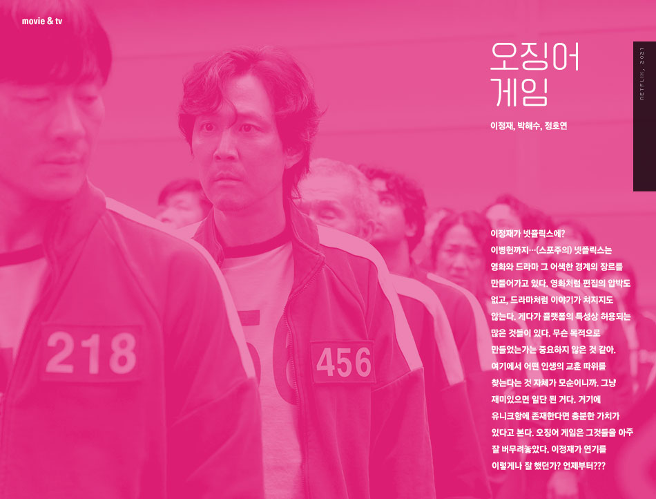 이정재가 넷플릭스에? 이병헌까지…(스포주의) 넷플릭스는 영화와 드라마 그 어색한 경계의 장르를 만들어가고 있다. 영화처럼 편집의 압박도 없고, 드라마처럼 이야기가 쳐지지도 않는다. 게다가 플랫폼의 특성상 허용되는 많은 것들이 있다. 무슨 목적으로 만들었는가는 중요하지 않은 것 같아. OTT에서 어떤 인생의 교훈 따위를 찾는다는 것 자체가 모순이니까. 그냥 재미있으면 일단 된 거다. 거기에 유니크함에 존재한다면 충분한 가치가 있다고 본다. 오징어 게임은 그것들을 아주 잘 버무려놓았다. 이정재가 연기를 이렇게나 잘 했던가? 언제부터???