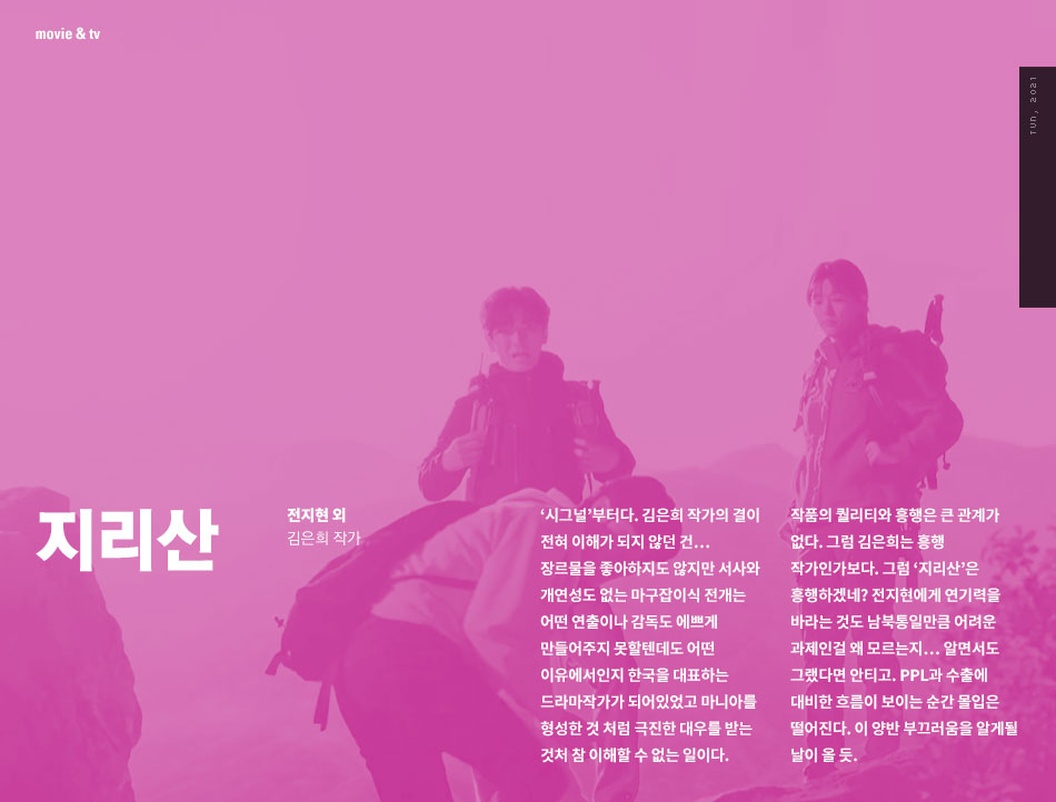 ‘시그널’부터다. 김은희 작가의 결이 전혀 이해가 되지 않던 건… 장르물을 좋아하지도 않지만 서사와 개연성도 없는 마구잡이식 전개는 어떤 연출이나 감독도 에쁘게 만들어주지 못할텐데도 어떤 이유에서인지 한국을 대표하는 드라마작가가 되어있었고 마니아를 형성한 것 처럼 극진한 대우를 받는 것처 참 이해할 수 없는 일이다. 작품의 퀄리티와 흥행은 큰 관계가 없다. 그럼 김은희는 흥행 작가인가보다. 그럼 ‘지리산’은 흥행하겠네? 전지현에게 연기력을 바라는 것도 남북통일만큼 어려운 과제인걸 왜 모르는지… 알면서도 그랬다면 안티고. PPL과 수출에 대비한 흐름이 보이는 순간 몰입은 떨어진다. 이 양반 부끄러움을 알게될 날이 올 듯.