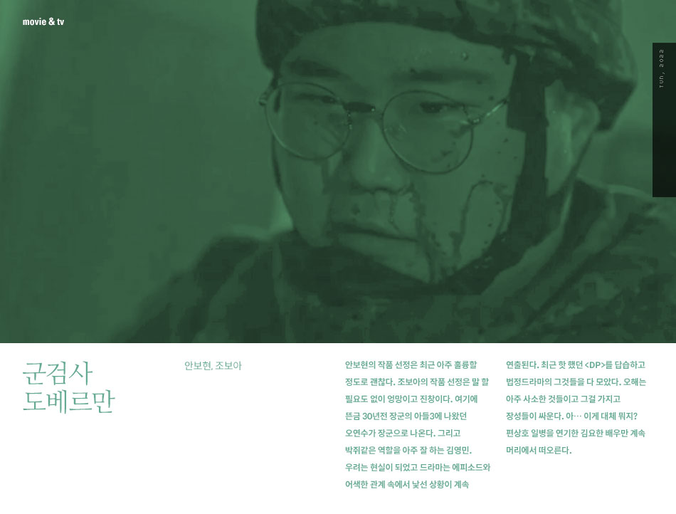 안보현의 작품 선정은 최근 아주 훌륭할 정도로 괜찮다. 조보아의 작품 선정은 말 할 필요도 없이 엉망이고 진창이다. 여기에 뜬금 30년전 장군의 아들3에 나왔던 오연수가 장군으로 나온다. 그리고 박쥐같은 역할을 아주 잘 하는 김영민. 우려는 현실이 되었고 드라마는 에피소드와 어색한 관계 속에서 낯선 상황이 계속 연출된다. 최근 핫 했던 <DP>를 답습하고 법정드라마의 그것들을 다 모았다. 오해는 아주 사소한 것들이고 그걸 가지고 장성들이 싸운다. 아… 이게 대체 뭐지? 편상호 일병을 연기한 김요한 배우만 계속 머리에서 떠오른다.