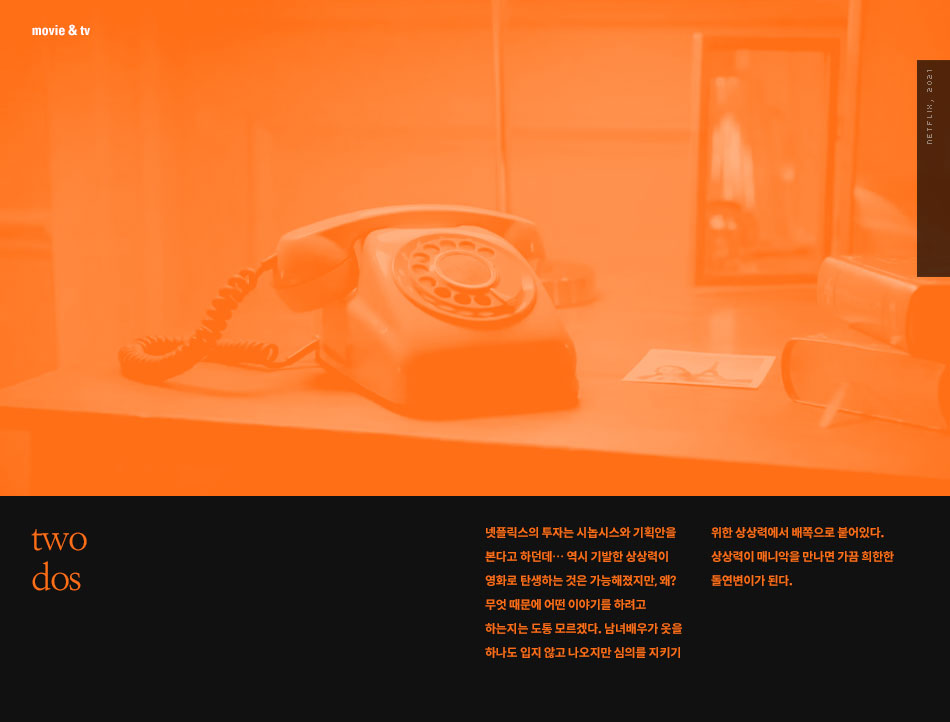 넷플릭스의 투자는 시놉시스와 기획안을 본다고 하던데… 역시 기발한 상상력이 영화로 탄생하는 것은 가능해졌지만, 왜? 무엇 때문에 어떤 이야기를 하려고 하는지는 도통 모르겠다. 남녀배우가 옷을 하나도 입지 않고 나오지만 심의를 지키기 위한 상상력에서 배쪽으로 붙어있다. 상상력이 매니악을 만나면 가끔 희한한 돌연변이가 된다.