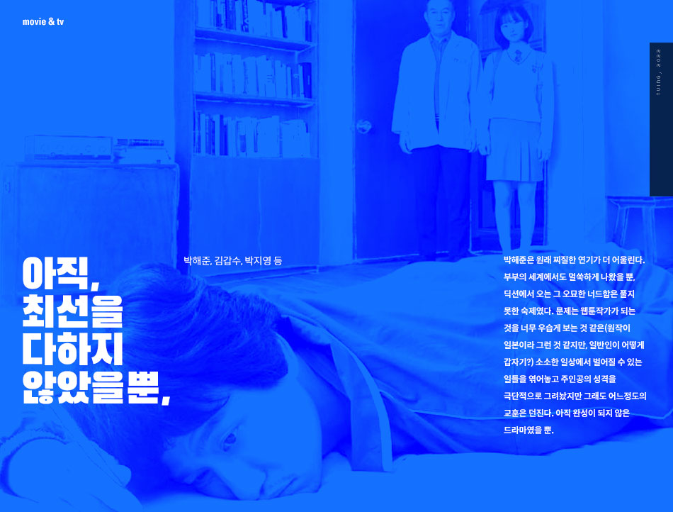 박해준은 원래 찌질한 연기가 더 어울린다. 부부의 세계에서도 멀쑥하게 나왔을 뿐, 딕션에서 오는 그 오묘한 너드함은 풀지 못한 숙제였다. 문제는 웹툰작가가 되는 것을 너무 우습게 보는 것 같은(원작이 일본이라 그런 것 같지만, 일반인이 어떻게 갑자기?) 소소한 일상에서 벌어질 수 있는 일들을 엮어놓고 주인공의 성격을 극단적으로 그려놨지만 그래도 어느정도의 교훈은 던진다. 아직 완성이 되지 않은 드라마였을 뿐.