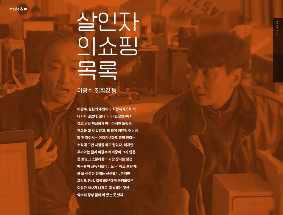 이광수, 설현의 주연이라 시청하기조차 썩 내키지 않았다. 보나마나 <런닝맨>에서 갈고 닦은 찌질함과 마니아적인 드립과 개그를 칠 것 같았고, 또 되게 이쁜척 어버버 할 것 같아서… 게다가 8화로 종영 한다는 소식에 그만 시청을 하고 말았다. 하지만 우려와는 달리 이광수의 비중이 크지 않은 듯 보였고 스릴러물의 가장 좋다는 낯선 배우들이 잔뜩 나왔다. ‘오…’ 하고 놀랄 때 쯤 또 신선한 전개는 신선했다. 하지만 그것도 잠시. 결국 80년대 방공영화같은 이상한 서사가 나왔고, 피날레는 뒷산 약수터 정상 쯤에 와 있는 듯 했다.