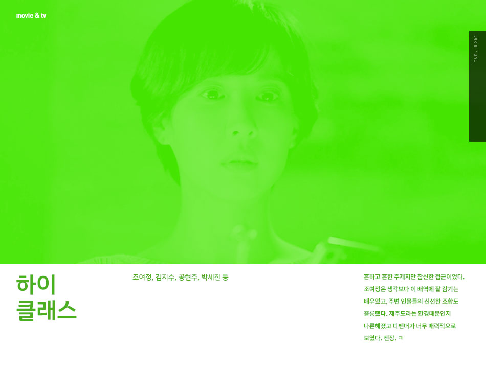 흔하고 흔한 주제지만 참신한 접근이었다. 조여정은 생각보다 이 배역에 잘 감기는 배우였고, 주변 인물들의 신선한 조합도 훌륭했다. 제주도라는 환경때문인지 나른해졌고 디펜더가 너무 매력적으로 보였다. 젠장. ㅋ