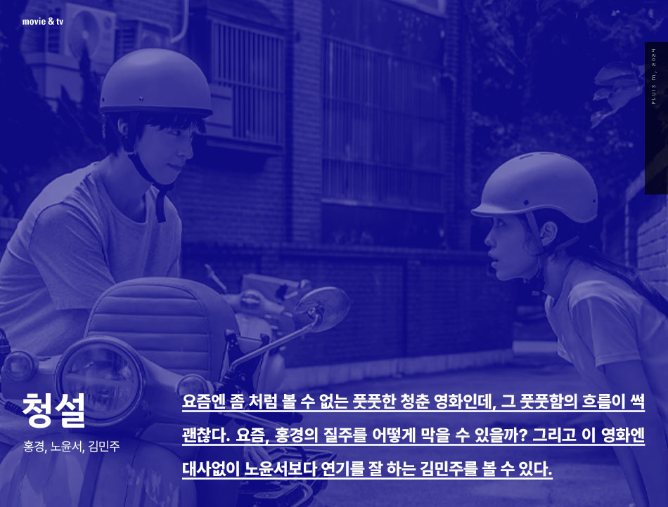 요즘엔 좀 처럼 볼 수 없는 풋풋한 청춘 영화인데, 그 풋풋함의 흐름이 썩 괜찮다. 요즘, 홍경의 질주를 어떻게 막을 수 있을까? 그리고 이 영화엔 대사없이 노윤서보다 연기를 잘 하는 김민주를 볼 수 있다.