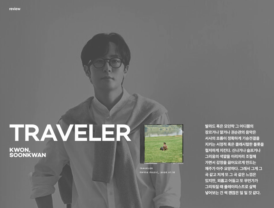 발라드 혹은 모던락 그 어디쯤의 장르거나 말거나 권순관의 음악은 서사의 흐름이 정확하게 기승전결을 지키는 서정적 혹은 클래시컬한 플롯을 철저하게 지킨다. 신나거나 슬프거나 그리움의 색깔을 이리저리 조절해 가면서 감정을 끓어오르게 만드는 재주가 아주 요망하다. 그래서 그게 그 곡 같고 저게 또 그 곡 같은 느낌은 있지만, 외롭고 어둡고 또 무언가가 그리워질 때 플레이리스트로 살짝 넣어보는 건 썩 괜찮은 일 일 것 같다.