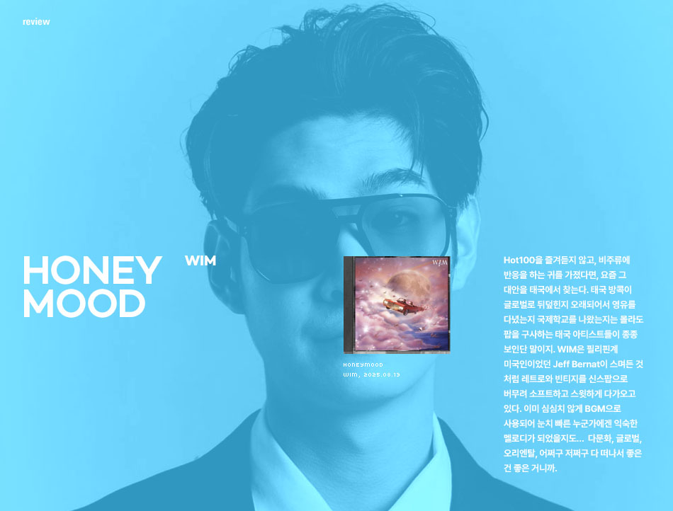 Hot100을 즐겨듣지 않고, 비주류에 반응을 하는 귀를 가졌다면, 요즘 그 대안을 태국에서 찾는다. 태국 방콕이 글로벌로 뒤덮힌지 오래되어서 영유를 다녔는지 국제학교를 나왔는지는 몰라도 팝을 구사하는 태국 아티스트들이 종종 보인단 말이지. WIM은 필리핀계 미국인이었던 Jeff Bernat이 스며든 것 처럼 레트로와 빈티지를 신스팝으로 버무려 소프트하고 스윗하게 다가오고 있다. 이미 심심치 않게 BGM으로 사용되어 눈치 빠른 누군가에겐 익숙한 멜로디가 되었을지도… 다문화, 글로벌, 오리엔탈, 어쩌구 저쩌구 다 떠나서 좋은 건 좋은 거니까.