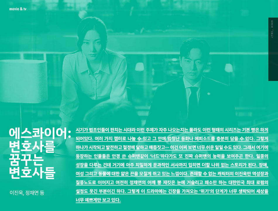 시기가 법조인들이 판치는 시대라 이런 주제가 자주 나오는지는 몰라도 이런 형태의 시리즈는 기본 빵은 하게 되어있다. 여러 가지 챕터로 나눌 수 있고 그 안에 엄청난 동화나 에피소드를 충분히 담을 수 있다. 그렇게 하나가 시작되고 발전하고 절정에 달하고 매듭짓고… 이건 어찌 보면 너무 쉬운 일일 수도 있다. 그래서 여기에 등장하는 인물들은 안경 쓴 슈퍼맨같이 ‘너드’하다가도 또 진짜 슈퍼맨의 능력을 보여주곤 한다. 일종의 성장을 다루는 건데 거기에 아주 치밀하게 문과적인 서사까지 입히면 더할 나위 없는 스토리가 된다. 장애, 여성 그리고 동물에 대한 얇은 끈을 모질게 쥐고 있는 느낌이다. 존재할 수 없는 캐릭터의 이진욱만 역성장과 질풍노도로 이어지고 여전히 정채연의 어깨 뽕 재킷은 눈에 거슬리고 패소만 하는 대한민국 최대 로펌의 설정도 웃긴 부분이긴 하다. 그렇게 이 드라마에는 긴장을 가져오는 ‘위기’의 단계가 너무 생략되어 세상을 너무 예쁘게만 보고 있다.