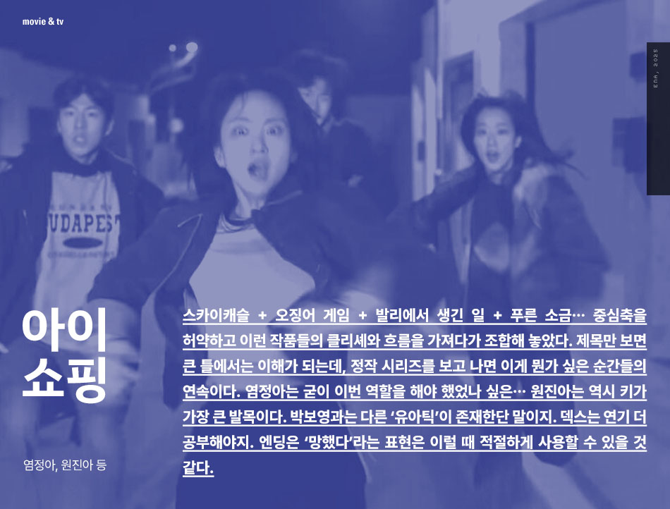 스카이캐슬 + 오징어 게임 + 발리에서 생긴 일 + 푸른 소금… 중심축을 허약하고 이런 작품들의 클리셰와 흐름을 가져다가 조합해 놓았다. 제목만 보면 큰 틀에서는 이해가 되는데, 정작 시리즈를 보고 나면 이게 뭔가 싶은 순간들의 연속이다. 염정아는 굳이 이번 역할을 해야 했었나 싶은… 원진아는 역시 키가 가장 큰 발목이다. 박보영과는 다른 ‘유아틱’이 존재한단 말이지. 덱스는 연기 더 공부해야지. 엔딩은 ‘망했다’라는 표현은 이럴 때 적절하게 사용할 수 있을 것 같다.