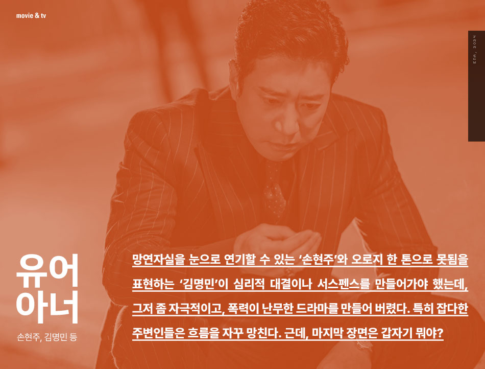 망연자실을 눈으로 연기할 수 있는 ‘손현주’와 오로지 한 톤으로 못됨을 표현하는 ‘김명민’이 심리적 대결이나 서스펜스를 만들어가야 했는데, 그저 좀 자극적이고, 폭력이 난무한 드라마를 만들어 버렸다. 특히 잡다한 주변인들은 흐름을 자꾸 망친다. 근데, 마지막 장면은 갑자기 뭐야?