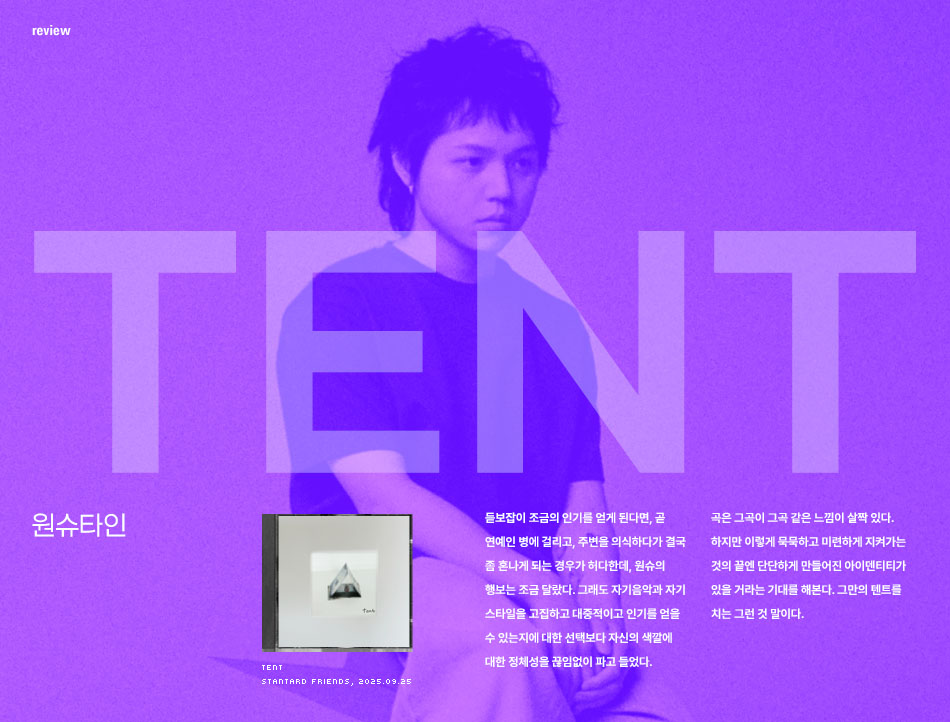 듣보잡이 조금의 인기를 얻게 된다면, 곧 연예인 병에 걸리고, 주변을 의식하다가 결국 좀 혼나게 되는 경우가 허다한데, 원슈의 행보는 조금 달랐다. 그래도 자기음악과 자기 스타일을 고집하고 대중적이고 인기를 얻을 수 있는지에 대한 선택보다 자신의 색깔에 대한 정체성을 끊임없이 파고 들었다. 곡은 그곡이 그곡 같은 느낌이 살짝 있다. 하지만 이렇게 묵묵하고 미련하게 지켜가는 것의 끝엔 단단하게 만들어진 아이덴티티가 있을 거라는 기대를 해본다. 그만의 텐트를 치는 그런 것 말이다.