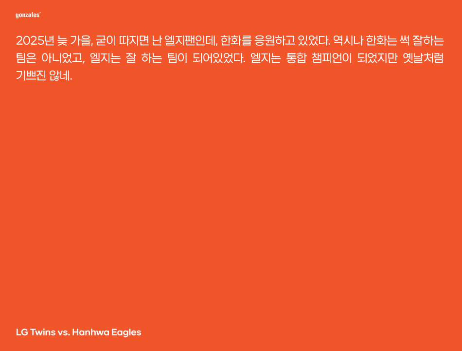 2025년 늦 가을, 굳이 따지면 난 엘지팬인데, 한화를 응원하고 있었다. 역시나 한화는 썩 잘하는 팀은 아니었고, 엘지는 잘 하는 팀이 되어있었다. 통합 챔피언이 되었지만 옛날처럼 기쁘진 않네.