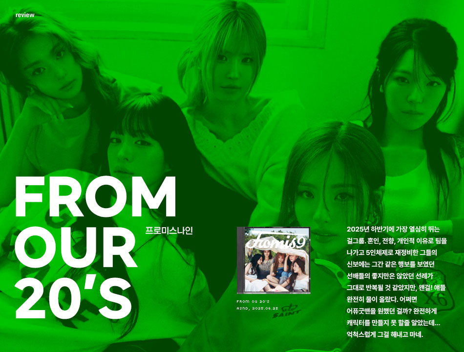 2025년 하반기에 가장 열심히 뛰는 걸그룹. 혼인, 전향, 개인적 이유로 팀을 나가고 5인체제로 재정비한 그들의 신보에는 그간 같은 행보를 보였던 선배들의 좋지만은 않았던 선례가 그대로 반복될 것 같았지만, 왠걸! 얘들 완전히 물이 올랐다. 어쩌면 어퓨굿맨을 원했던 걸까? 완전하게 캐릭터를 만들지 못 할줄 알았는데… 억척스럽게 그걸 해내고 마네.