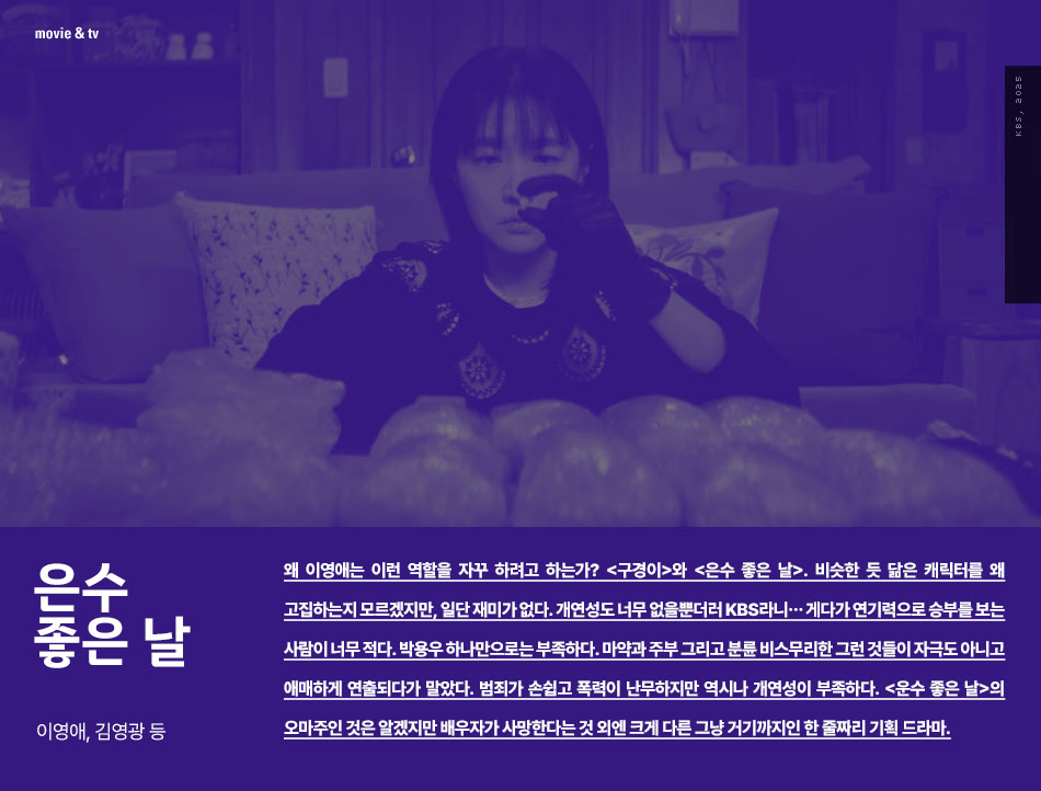 왜 이영애는 이런 역할을 자꾸 하려고 하는가? <구경이>와 <은수 좋은 날>. 비슷한 듯 닮은 캐릭터를 왜 고집하는지 모르겠지만, 일단 재미가 없다. 개연성도 너무 없을뿐더러 KBS라니… 게다가 연기력으로 승부를 보는 사람이 너무 적다. 박용우 하나만으로는 부족하다. 마약과 주부 그리고 분륜 비스무리한 그런 것들이 자극도 아니고 애매하게 연출되다가 말았다. 범죄가 손쉽고 폭력이 난무하지만 역시나 개연성이 부족하다. <운수 좋은 날>의 오마주인 것은 알겠지만 배우자가 사망한다는 것 외엔 크게 다른 그냥 거기까지인 한 줄짜리 기획 드라마.
