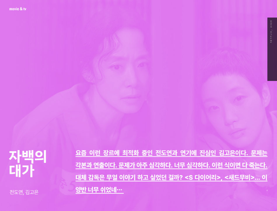 요즘 이런 장르에 최적화 중인 전도연과 연기에 진심인 김고은이다. 문제는 각본과 연출이다. 문제가 아주 심각하다. 너무 심각하다. 이런 식이면 다 죽는다. 대체 감독은 무얼 이야기 하고 싶었던 걸까? <S 다이어리>, <새드무비>… 이 양반 너무 쉬었네…