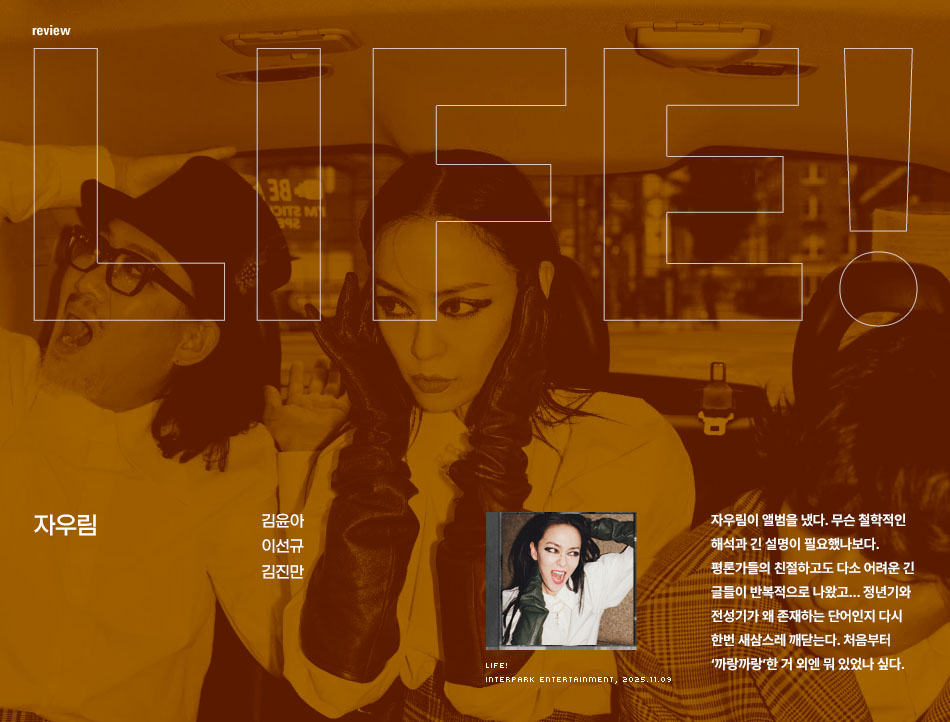 자우림이 앨범을 냈다. 무슨 철학적인 해석과 긴 설명이 필요했나보다. 평론가들의 친절하고도 다소 어려운 긴 글들이 반복적으로 나왔고… 정년기와 전성기가 왜 존재하는 단어인지 다시 한번 새삼스레 깨닫는다. 처음부터 ‘까랑까랑’한 거 외엔 뭐 있었나 싶다.