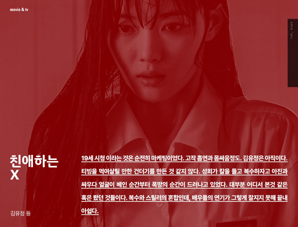 19세 시청 이라는 것은 순전히 마케팅이었다. 고작 흡연과 몸싸움정도. 김유정은 아직이다. 티빙을 먹여살릴 만한 건더기를 만든 것 같지 않다. 성희가 칼을 들고 복수하자고 아진과 싸우다 얼굴이 베인 순간부터 폭망의 순간이 드러나고 있었다. 대부분 어디서 본것 같은 혹은 봤던 것들이다. 복수와 스릴러의 혼합인데, 배우들의 연기가 그렇게 찰지지 못해 끝내 아쉽다.