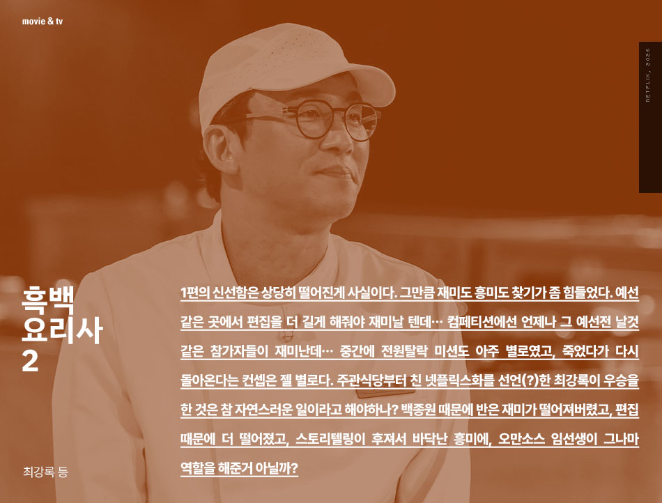 1편의 신선함은 상당히 떨어진게 사실이다. 그만큼 재미도 흥미도 찾기가 좀 힘들었다. 예선 같은 곳에서 편집을 더 길게 해줘야 재미날 텐데… 컴페티션에선 언제나 그 예선전 날것 같은 참가자들이 재미난데… 중간에 전원탈락 미션도 아주 별로였고, 죽었다가 다시 돌아온다는 컨셉은 젤 별로다. 주관식당부터 친 넷플릭스화를 선언(?)한 최강록이 우승을 한 것은 참 자연스러운 일이라고 해야하나? 백종원 때문에 반은 재미가 떨어져버렸고, 편집 때문에 더 떨어졌고, 스토리텔링이 후져서 바닥난 흥미에, 오만소스 임선생이 그나마 역할을 해준거 아닐까?