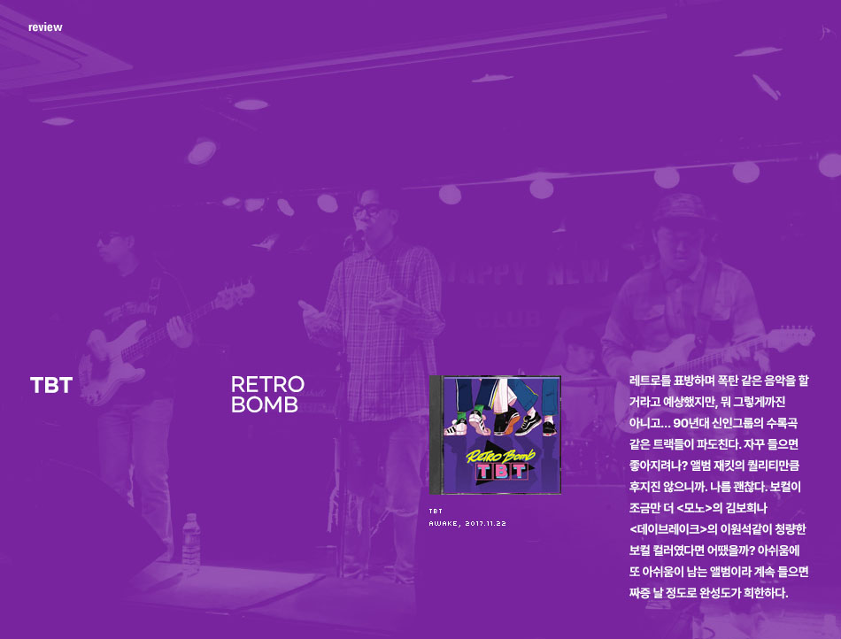 레트로를 표방하며 폭탄 같은 음악을 할 거라고 예상했지만, 뭐 그렇게까진 아니고… 90년대 신인그룹의 수록곡 같은 트랙들이 파도친다. 자꾸 들으면 좋아지려나? 앨범 재킷의 퀄리티만큼 후지진 않으니까. 나름 괜찮다. 보컬이 조금만 더 <모노>의 김보희나 <데이브레이크>의 이원석같이 청량한 보컬 컬러였다면 어땠을까? 아쉬움에 또 아쉬움이 남는 앨범이라 계속 들으면 짜증 날 정도로 완성도가 희한하다.
