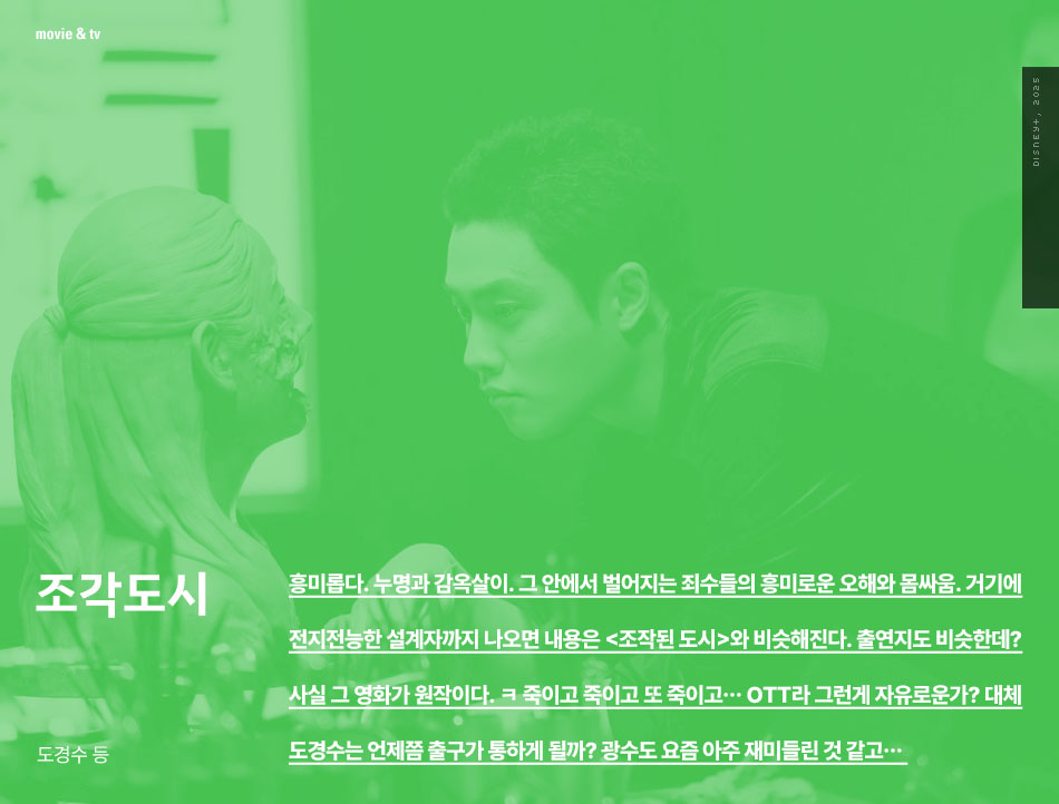 흥미롭다. 누명과 감옥살이. 그 안에서 벌어지는 죄수들의 흥미로운 오해와 몸싸움. 거기에 전지전능한 설계자까지 나오면 내용은 <조작된 도시>와 비슷해진다. 출연지도 비슷한데? 사실 그 영화가 원작이다. ㅋ 죽이고 죽이고 또 죽이고… OTT라 그런게 자유로운가? 대체 도경수는 언제쯤 출구가 통하게 될까? 광수도 요즘 아주 재미들린 것 같고…