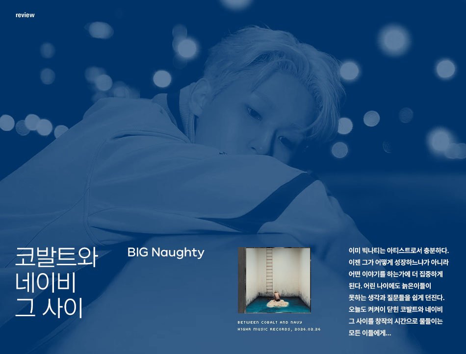 이미 빅나티는 아티스트로서 충분하다. 이젠 그가 어떻게 성장하느냐가 아니라 어떤 이야기를 하는가에 더 집중하게 된다. 어린 나이에도 늙은이들이 못하는 생각과 질문들을 쉽게 던진다. 오늘도 켜켜이 닫힌 코발트와 네이비 그 사이를 창작의 시간으로 물들이는 모든 이들에게…