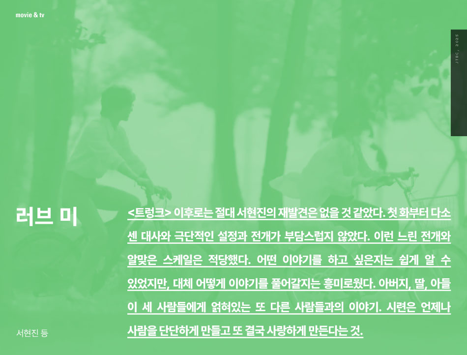 <트렁크> 이후로는 절대 서현진의 재발견은 없을 것 같았다. 첫 화부터 다소 센 대사와 극단적인 설정과 전개가 부담스럽지 않았다. 이런 느린 전개와 알맞은 스케일은 적당했다. 어떤 이야기를 하고 싶은지는 쉽게 알 수 있었지만, 대체 어떻게 이야기를 풀어갈지는 흥미로웠다. 아버지, 딸, 아들 이 세 사람들에게 얽혀있는 또 다른 사람들과의 이야기. 시련은 언제나 사람을 단단하게 만들고 또 결국 사랑하게 만든다는 것.