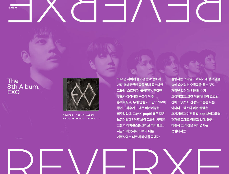 10여년 사이에 들어본 음악 중에서 가장 흥미로웠던 곡을 몇개 꼽는다면 그들의 ‘으르렁’이 들어간다. 간결한 루프와 감각적인 구성이 아주 흥미로웠고, 무대 연출도 그간의 SM에 쌓인 노하우가 그대로 아카이빙된 비주얼있다. 그냥 K-pop의 표준 같은 느낌이랄까? 이후 보이 그룹의 시작은 그들의 레퍼런스를 그대로 따라했고.. 지금도 비슷하다. SM이 다른 기획사와는 다르게 타이틀 곡에만 몰빵하는 스타일도 아니기에 정규 앨범 속에 숨어있는 수록곡을 찾는 것도 재미난 일이다. 멤버의 수가 조정되었고, 그간 어떤 일들이 있었던 간에 그것까지 신경쓰고 듣는 나는 아니니… 엑소의 이번 앨범은 후지지않고 여전히 K-pop 보이그룹의 현재를 그대로 이끌고 있다. 물론 데뷔곡 그 이상을 뛰어넘지는 못할테지만.